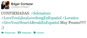 “CONFIRMADAS: #Selenators #LoveYouLikeALoveSongEnEspañol #Lovatics #GiveYourHeartABreakEnEspañol Em breve!!!!! ;)”