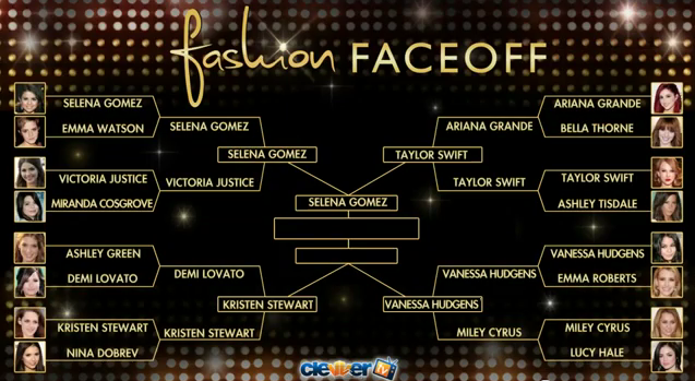 Graças a todos os votos, Selena Gomez passou para a final do Fashion Faceoff do ClevverTV! Agora, ela terá que esperar pela vencedora entre Taylor Swift e Vanessa Hudgens!